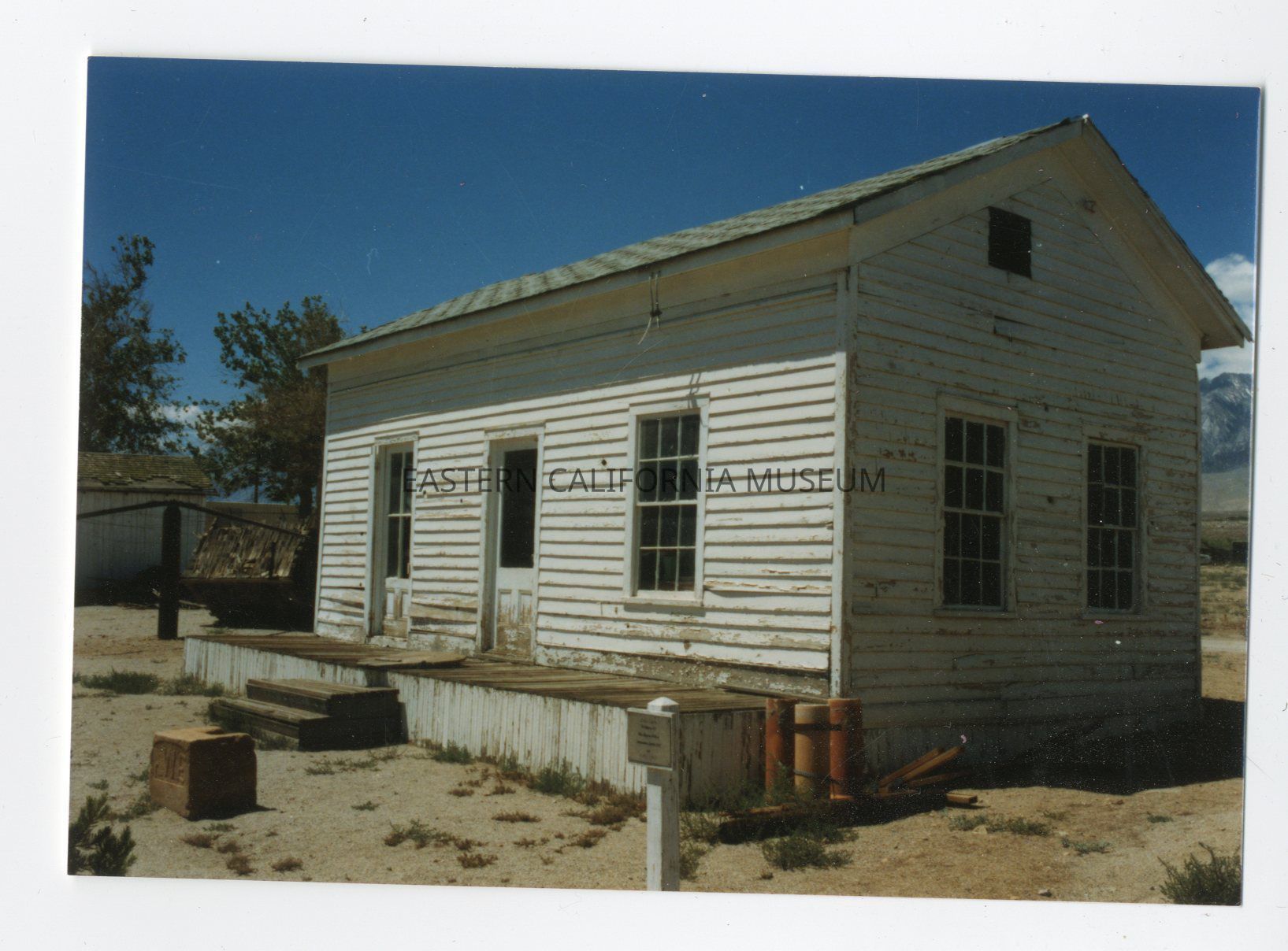 No. 2-15. This building was located in the Manzanar area in the early days then it was moved to Independence and added to the building in 2-16. (This was known as "Hannah House," and was built circa 1860 on Mt. Kearsarge, near the mine. After a big snow slide most of the buildings at the mine were destroyed except "Hannah House." It was then moved to DWP property on Washington Street in Independence. There it was used for DWP housing. The building had a veranda on the north, front and south side. Later, the building shown in 2-15 was attached. After water and electricity was added the house became one of the nicer homes in Independence. Following the death of George Lewis and his wife the buildings were salvaged and moved to the museum site.)