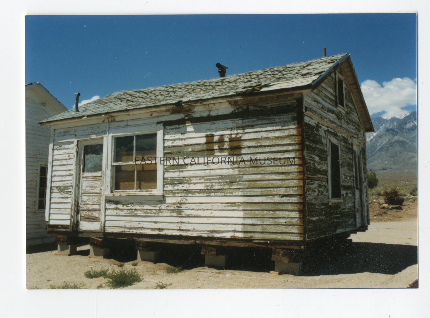 No. 2-16. This was known as "Hannah House," and was built circa 1860 on Mt. Kearsarge, near the mine. After a big snow slide most of the buildings at the mine were destroyed except "Hannah House." It was then moved to DWP property on Washington Street in Independence. There it was used for DWP housing. The building had a veranda on the north, front and south side. Later, the building shown in 2-15 was attached. After water and electricity was added the house became one of the nicer homes in Independence. Following the death of George Lewis and his wife the buildings were salvaged and moved to the museum site.