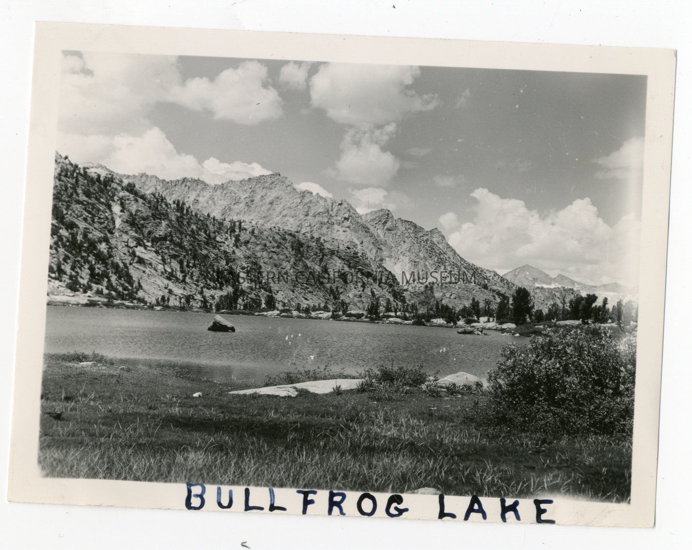 Photo of a lake with rocky mountains in the background. The foreground shows grass up to the water's edge. Written in black ink along bottom edge is "Bullfrog Lake."