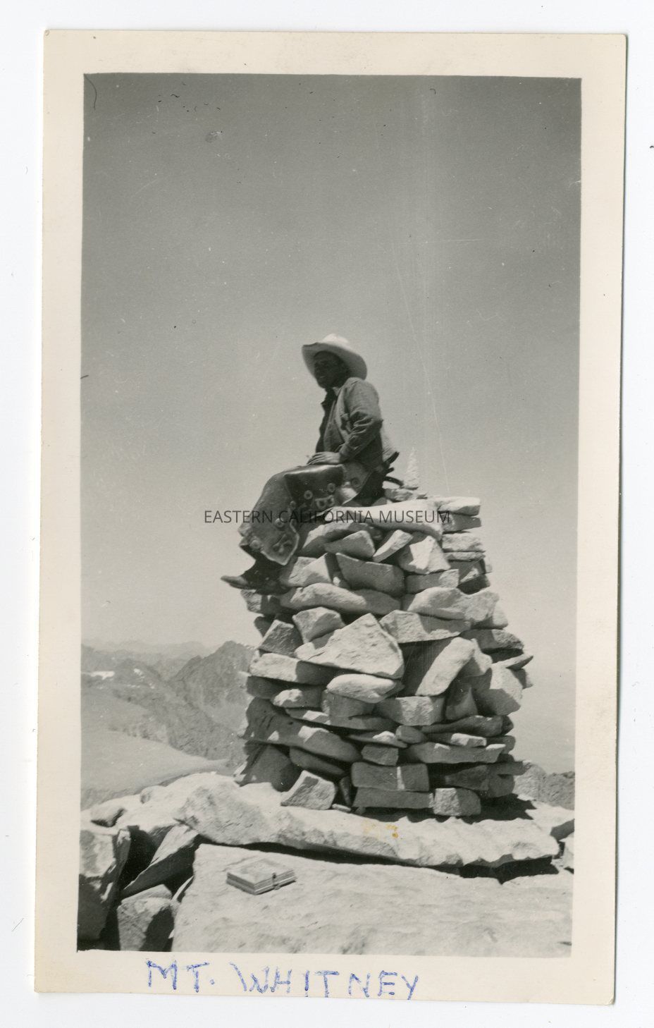 Photo of a man, likely Buck Hyers, sitting on the stone cairn at the summit of Mt. Whitney. He is wearing chaps say "Buck" and he's wearing a white cowboy hat. Written in blue ink along bottom ledge is "Mt. Whitney."