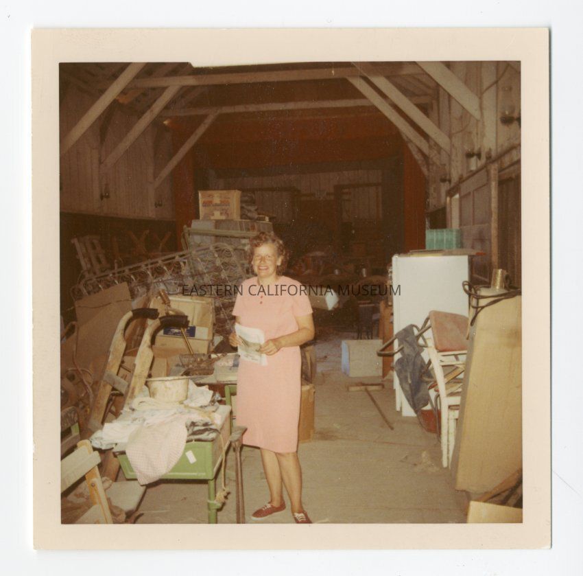 Small color photo of a woman standing inside the Keeler train depot.