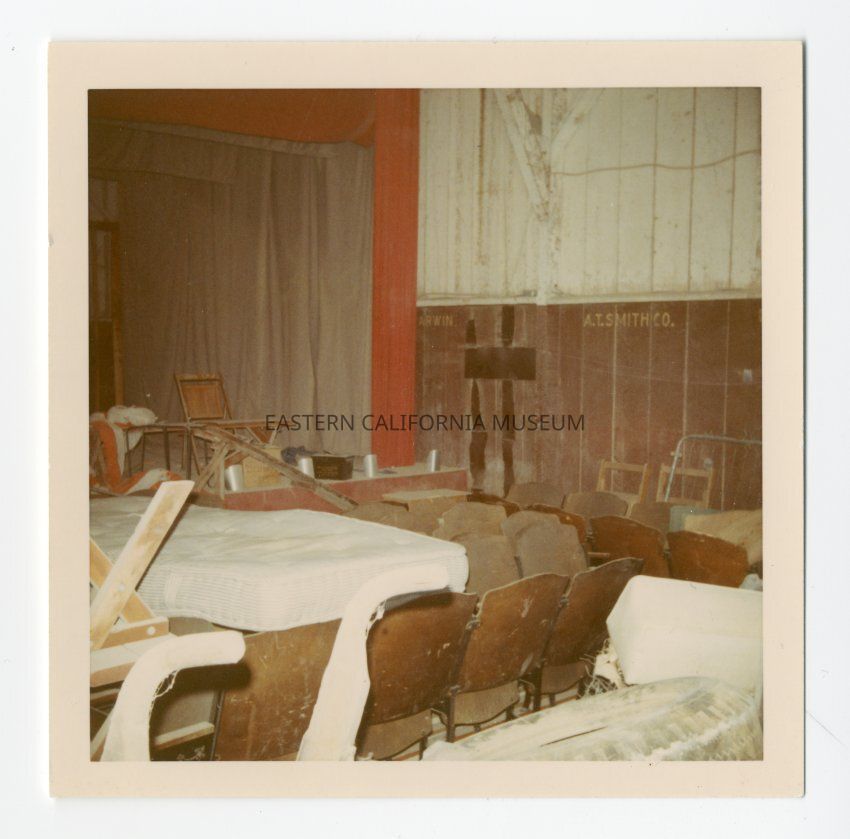 Small color photo of the interior of the Keeler train depot. Writing on the wall says, "Darwin" and "A. T. Smith Co."