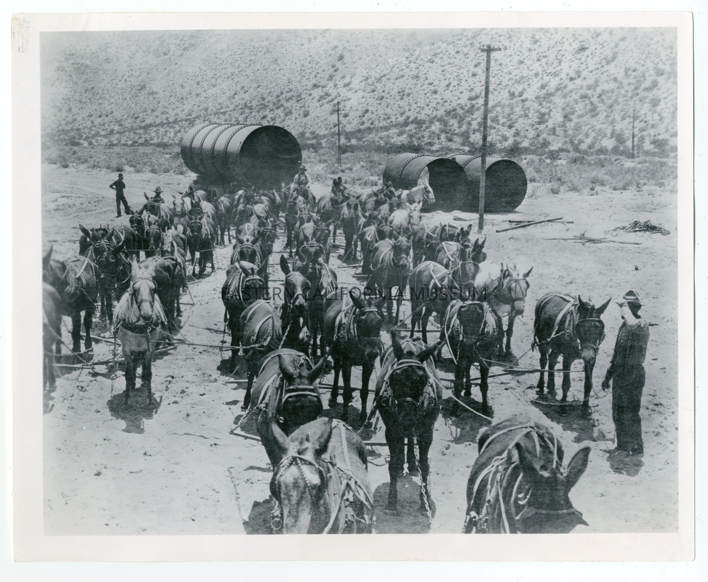 Photo of a massive 52-mule team hauling sections of pipe for the Jawbone Sipon on the Los Angeles Aqueduct from the railroad siding at Cinco. Cinco was the largest aqueduct supply base for the entire system.
