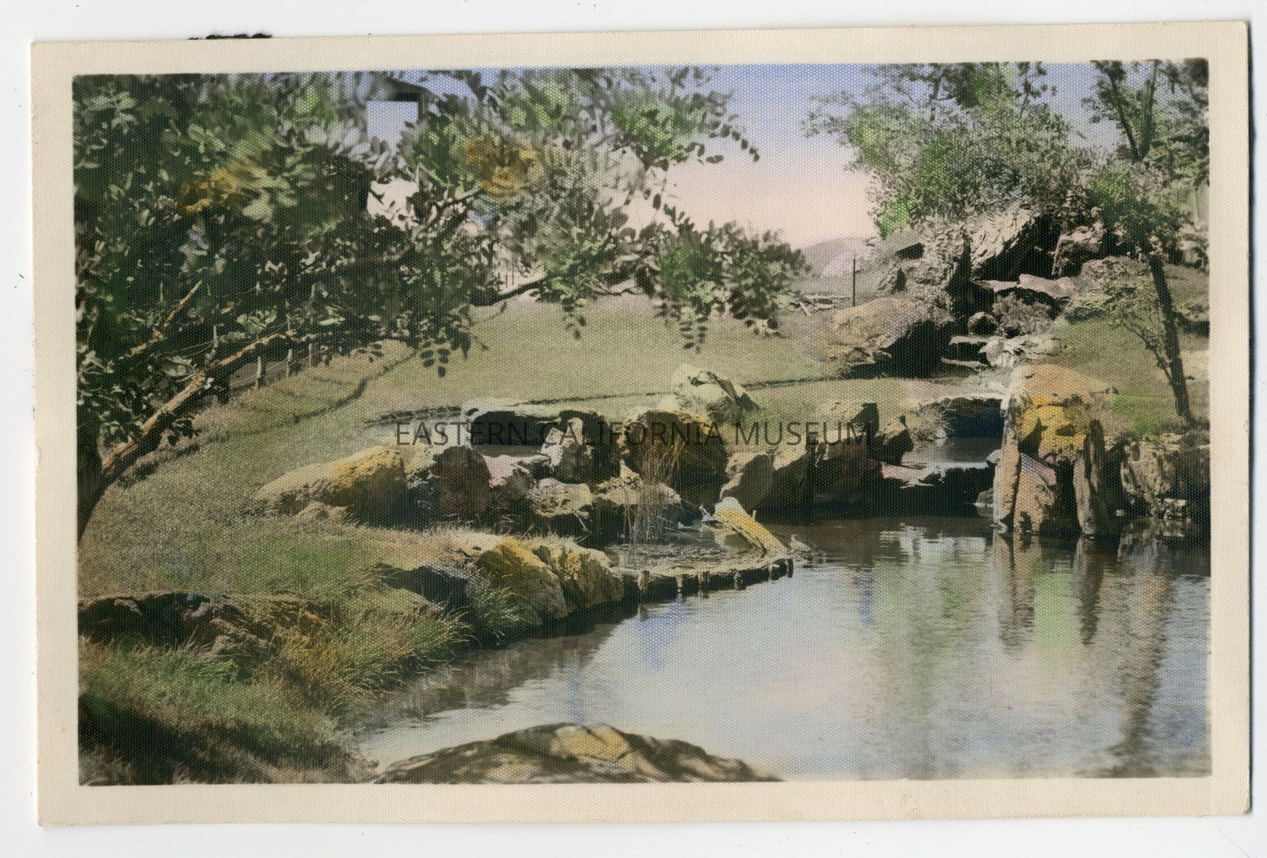 Hand colored photo of a pond and waterfall feature in one of the parks at Manzanar War Relocation Center.