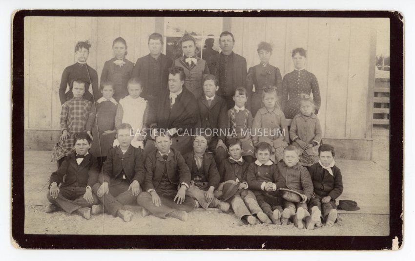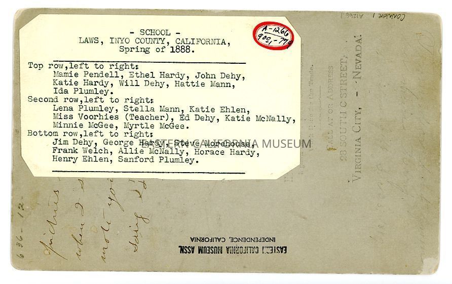 Typewritten label affixed to reverse: School, Laws, Inyo County, California, Spring of 1888. Top row, left to right: Mamie Pendell, Ethel Hardy, John Dehy, Katie Hardy, Will Dehy, Hattie Mann, Ida Plumley. Second row, left to right: Lena Plumley, Stella Mann, Katie Ehlen, Miss Voorhies (Teacher), Ed Dehy, Katie McNally, Minnie McGee, Myrtle McGee. Bottom row, left to right: Jim Dehy, George Hardy, Steve Morehouse, Frank Welch, Allie McNally, Horace Hardy, Henry Ehlen, Sanford Plumley.