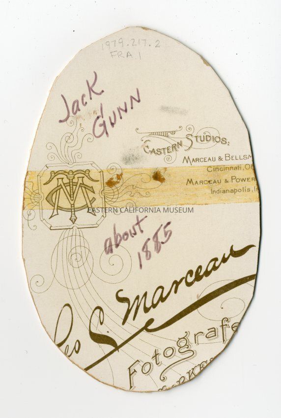 Mounted photograph of Jack Gunn in or around 1885. Photographed by Eastern Studios, Theodore C. Marceau. The photo was cut into an oval shape and has rough edges.Made/Created