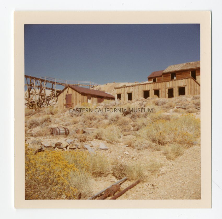 Small color photo of buildings at Cerro Gordo. The structure on the far left might be part of the tramway between Cerro Gordo and Keeler [needs verification].Collection
