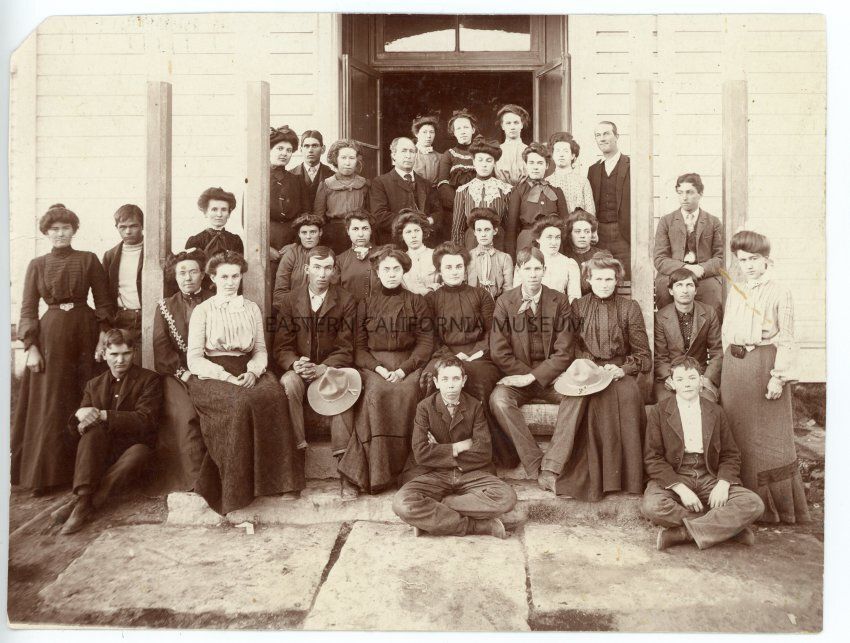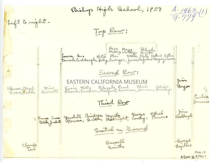 Photo of students at Bishop High School, 1903. A piece of paper was affixed to the back (now detached) identifying the people in the photo.