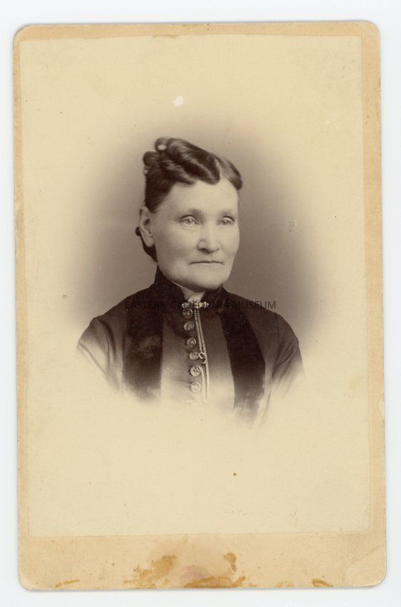 The accession information states that she was the wife of J. C. Anton and the mother of Cordelia Adams Johnson Anton, however information received from Stephen Landuyt via email in May 2022 pointed out that Cordelia was married to J. C. Anton, not Mary: My ancestors were among the early settlers in Lone Pine. One of my ancestors is Mary Adams McCall. The photo description erroneously reads, "She was the wife of J. C. Anton..." however, it was Mary's daughter Cordelia who was married to J.C. Anton, and not Mary. Mary Adams McCall was married to John J. McCall, who was her second husband. They lived outside of Lone Pine and are buried in the Pioneer Cemetery. Mary Adams McCall came to Lone Pine in about 1870 or 1871 with her two daughters (Cordelia and Ida Adams) from her first marriage to Frederick C. Adams who had died in San Francisco in 1862. John J. McCall died in 1875 and Mary Adams McCall did not remarry. In Lone Pine, daughter Cordelia Adams was first married to Albert H. Johnson, one of the town's founders buried in the Pioneer Cemetery, and following Mr. Johnson's death, Cordelia married J.C. Anton. Cordelia and Mr. Anton are buried in the Mt. Whitney Cemetery.Collection