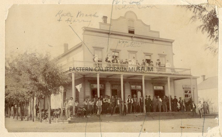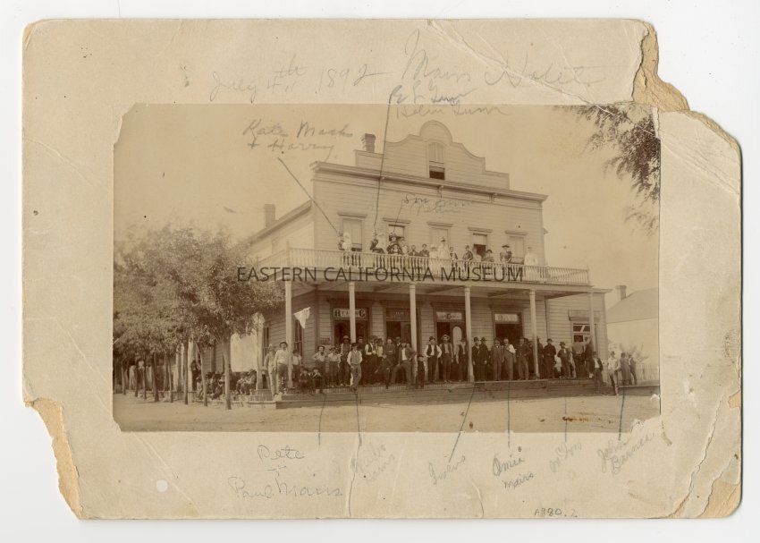 Old label says: Mairs Hotel, Independence, California, July 4, 1892. On balcony: Kate Mack and son Harry Mack. Eva Lee Gunn and daughter Helen Gunn. Lou Irwin and daughter Nettie Irwin. On porch are pete and Paul Mairs, Omie Mairs, Mr. McIvor and John Barnes. Others are unidentified.Collection