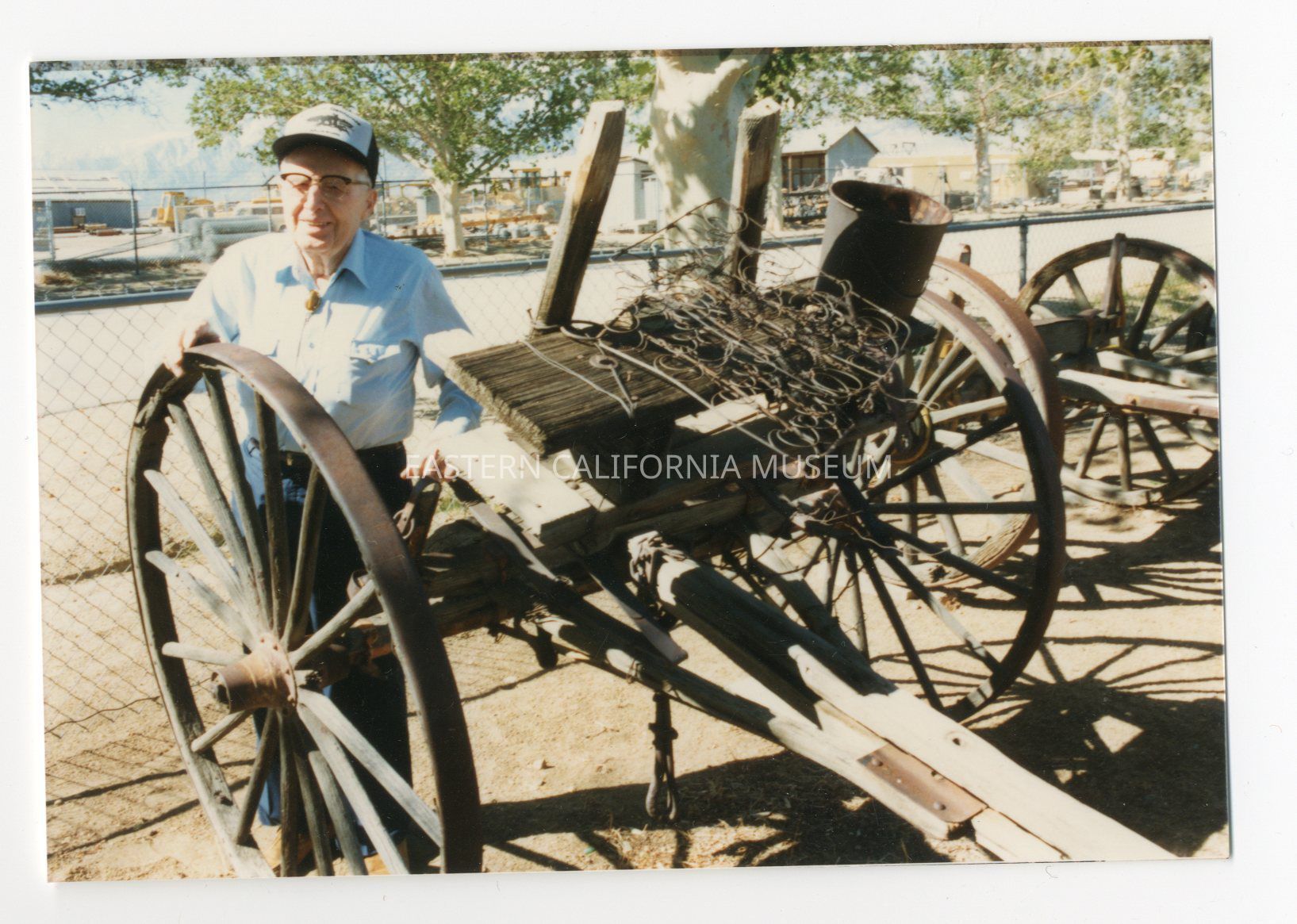 No. 2. Ditch Rider's Wagon was used along the "ditch" before the pickup truck. Hand tools, picks, shovels, and rope were carried behind the drivers seat to check for leaks and make necessary field repairs. A team of horses provided the motive power for the cart. The patrolman set up high on a spring seat. Nothing was normally attached to the wagon although a wagon could be hitched up to it. Gene Barrows is shown in photograph #2.