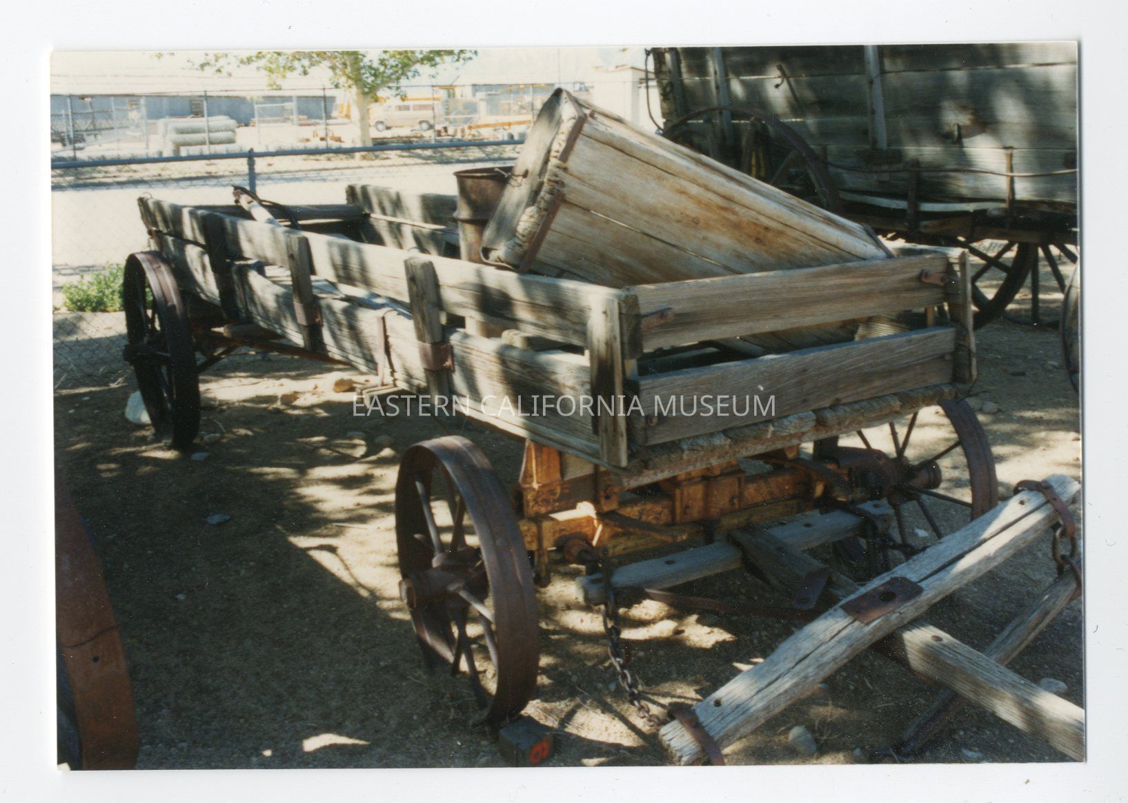 No. 7. A low-bed utility wagon with low sides which makes it easier to load and unload cargo. Since there is no seat visible, this wagon was pulled by a team of horses. However, a seat could be easily added. This has a short turn radius noted by the front wheels ability to turn under the bed. The small wheels seem to indicate that this type of wagon was not used for long hauling. Long-haul wagons would usually have larger wheels which requires less pulling power. Note the all-metal wheels, even the spokes. Also note the stay chain which is visible from the front axle to the doubletree.