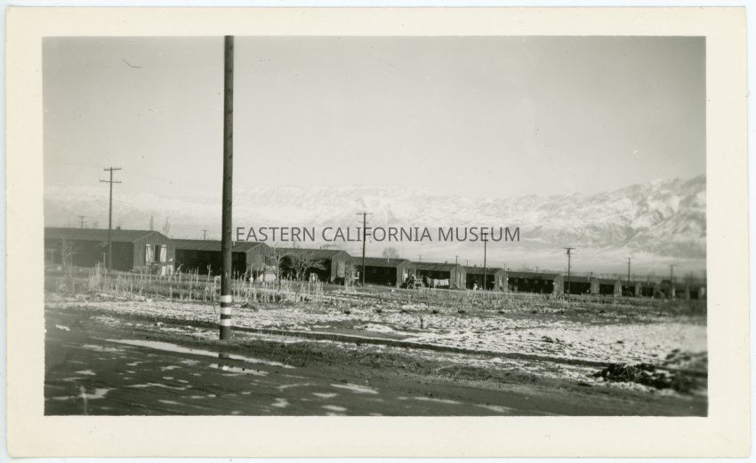 Photograph of the gardens and barracks at Manzanar Incarceration Camp with melting snow on the ground. The snow-covered Inyo mountains are visible in the background.