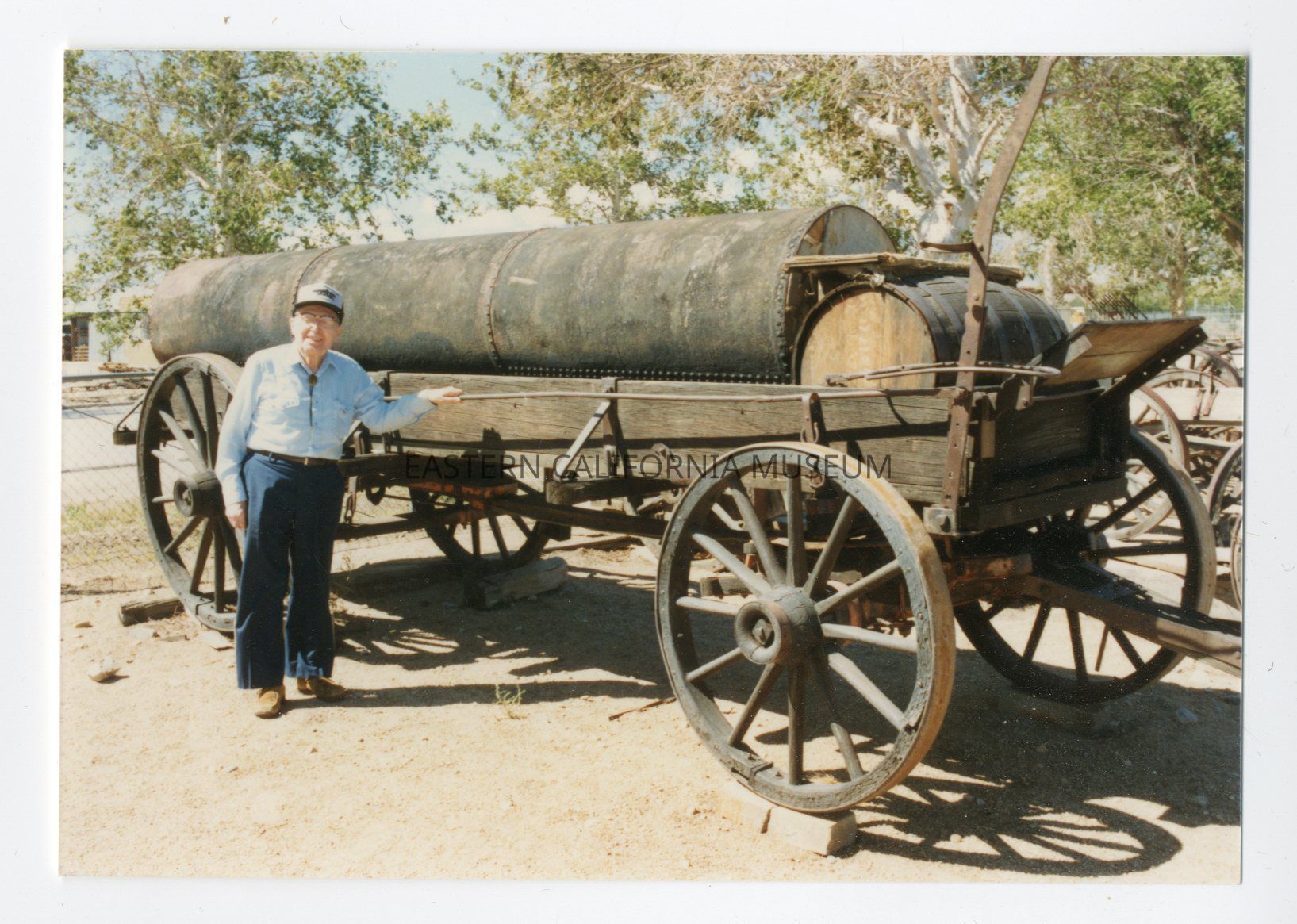 No. 20. DWP Water Wagon. Gene Barrows, DWP retiree and Eastern California Museum volunteer. This wagon is intact and used in various Inyo County events. The DWP "borrows" it from time to time for parades using DWP personnel. The seat is mounted on a barrel in front of the main tank.