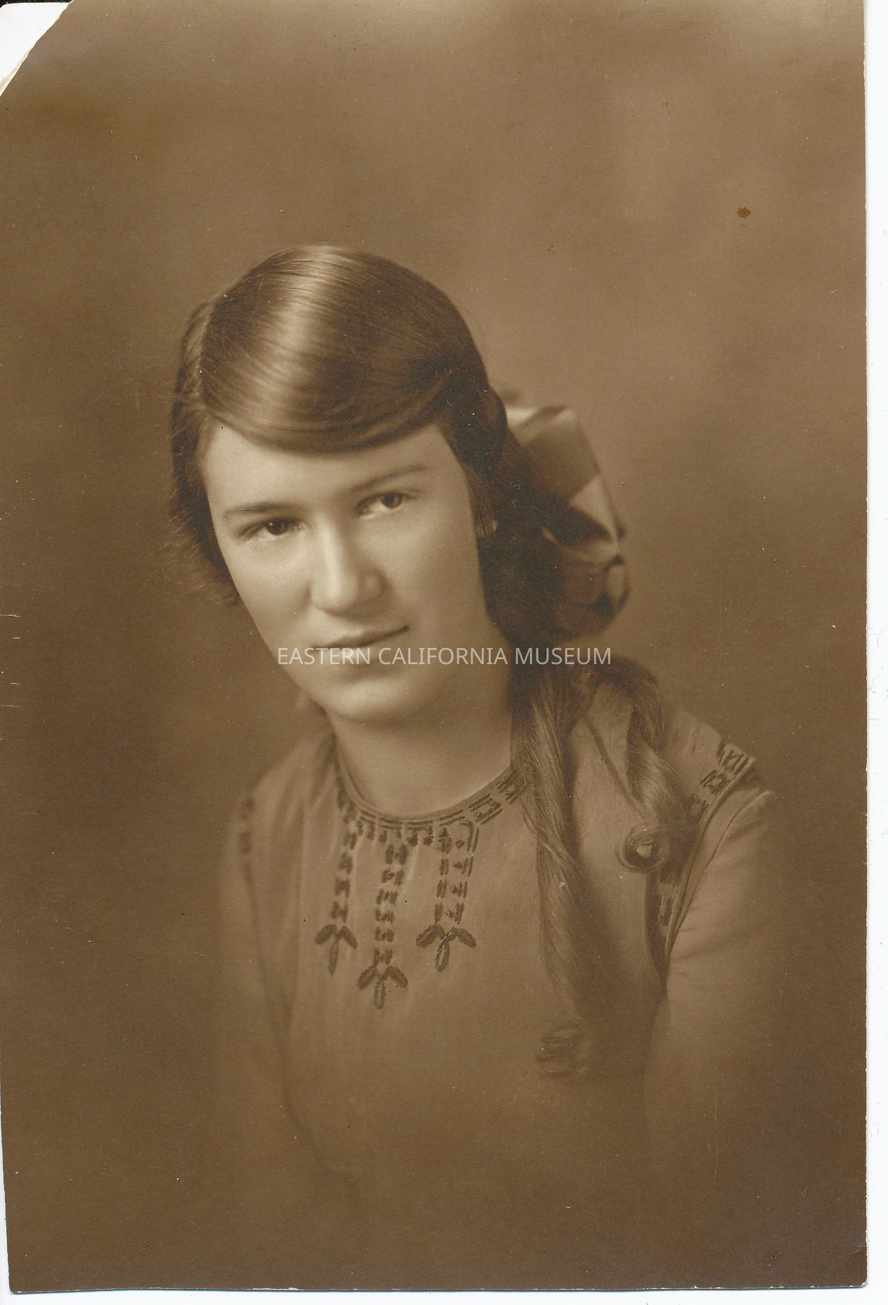 Sepia toned photograph of a young woman. Hair is curled in ringlets and held back in a large bow. The top of her blouse or dress has decorative embroidery/stitching. Top left corner is missing.