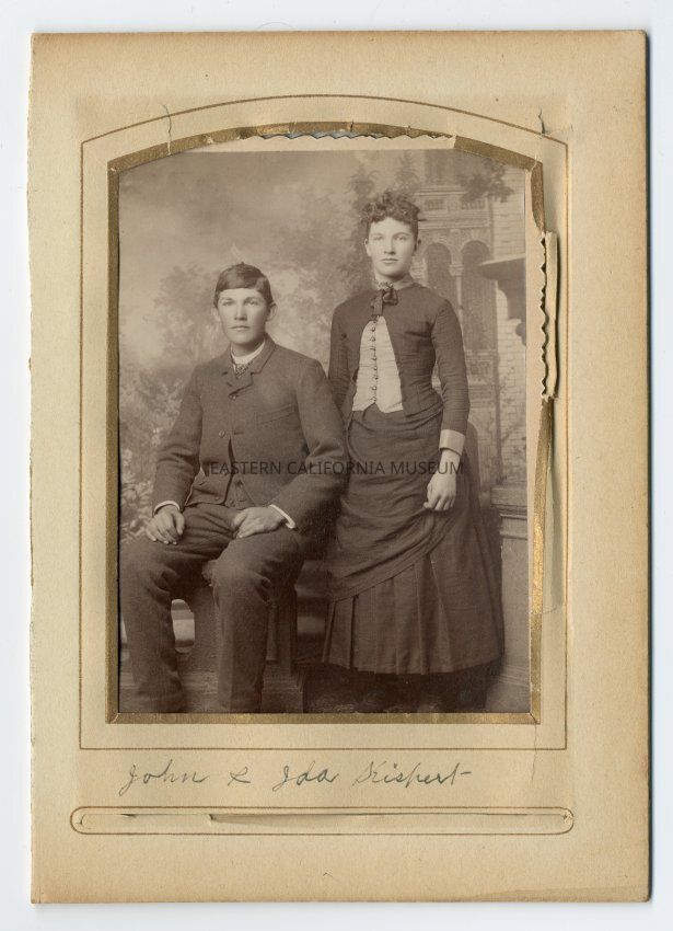 Information from the seller on ebay says: This is a great cabinet photo of siblings John Horace and Ida Grace Kispert, children of John and Augusta (Engel) Kispert. John Horace Kispert was born in George's Creek, Inyo County, California (near Bishop) on July 12, 1875. He married Clara Hutchison Gregg (1881-1962) and for years they lived in Inyo County where John was a blacksmith. They were the parents of two sons. Later they moved to Fallon, Churchill County, Nevada where John was involved in ranching. He died in Reno, Washoe County, Nevada on October 31, 1937 from a hemorrhaging duodenal ulcer. He was buried in the Churchill County Cemetery in Fallon, Nevada. Ida Grace Kispert was born in George's Creek, Inyo County, California on April 10, 1878. She married William Allen Shelly (1880-1964) and lived in Bishop, California. They were the parents of seven children. Ida died February 4, 1973 in Bishop and is buried in the East Line Street Cemetery there. The photo dates to the 1890s and the image is very clear.