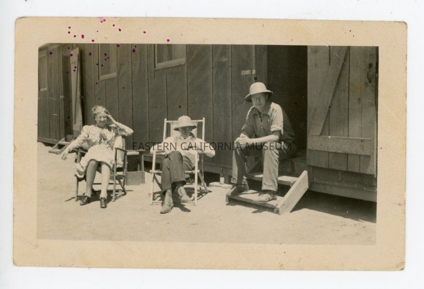 Black and white photo of three people sitting outside a barrack at Manzanar War Relocation Center. A woman on the left, and two men in what appear to be pith helments.There is a splatter of what appears to be red or purple ink on the photo. This photo was likely taken during Memorial Day of 1942.