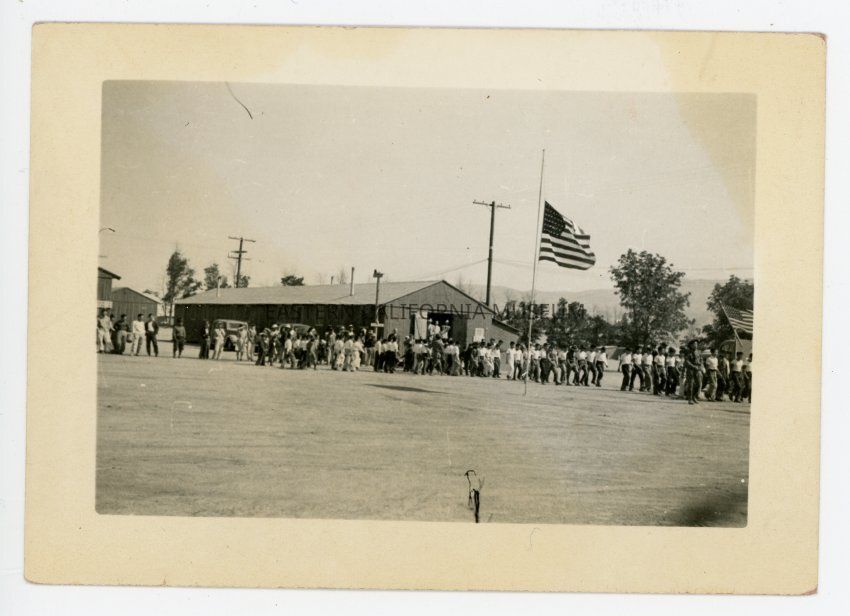Black and white photo of what is likely an outdoor Memorial Day event at Manzanar War Reolcation Center. It appears to be a photo of men with matching white shirts and dark pants (are they military men or Japanese-American internees?) marching or walking in organized lines. Barracks, telephone poles, a large American flag, and trees in background.