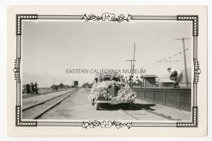 Black and white photograph with decorative frame taken during the Wedding of the Waters celebration in October 1937. This photo is of an automobile parked along the train tracks at Keeler and completely covered in flowers. There are some people on the train platform along with bunting and a water tower in background.