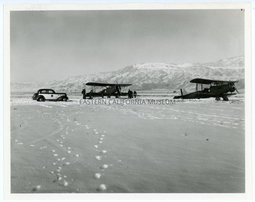 On reverse in pen, "C.N.G. [California National Guard] airplanes enroute with supplies for stranded mine workers at sulphur mines, Independence, Calif."