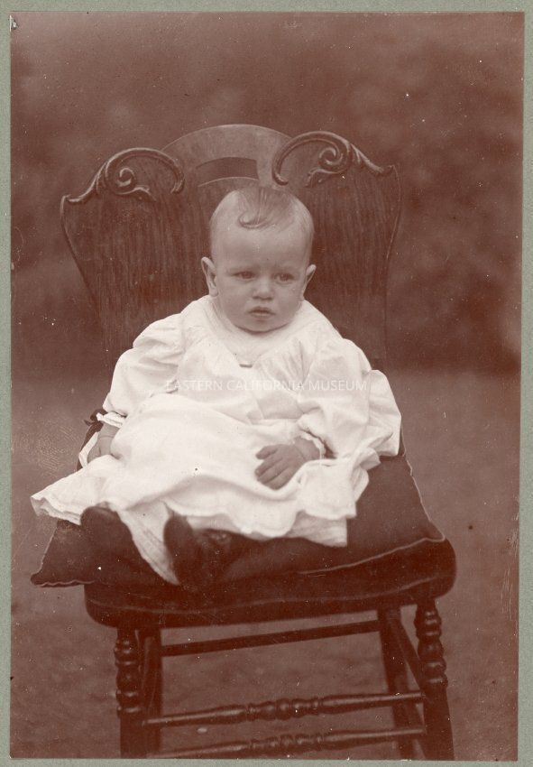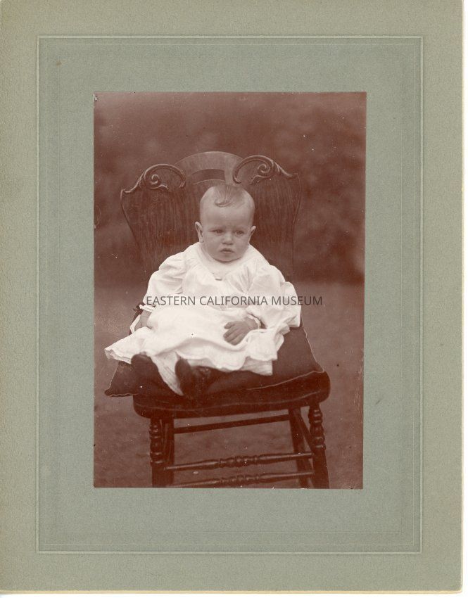 Mounted photo of a baby sitting on a carved chair. Writing in pencil on back: "Ray Mairs."