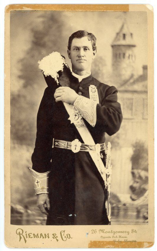 Photograph affixed to card of Hugh P. Edwards, oldest son of Thomas Edwards, wearing an elaborate uniform, feathered hat, sash, and holding a sword. Possibly a Masonic Lodge ceremonial uniform? Photo by Rieman and Co. of San Francisco.