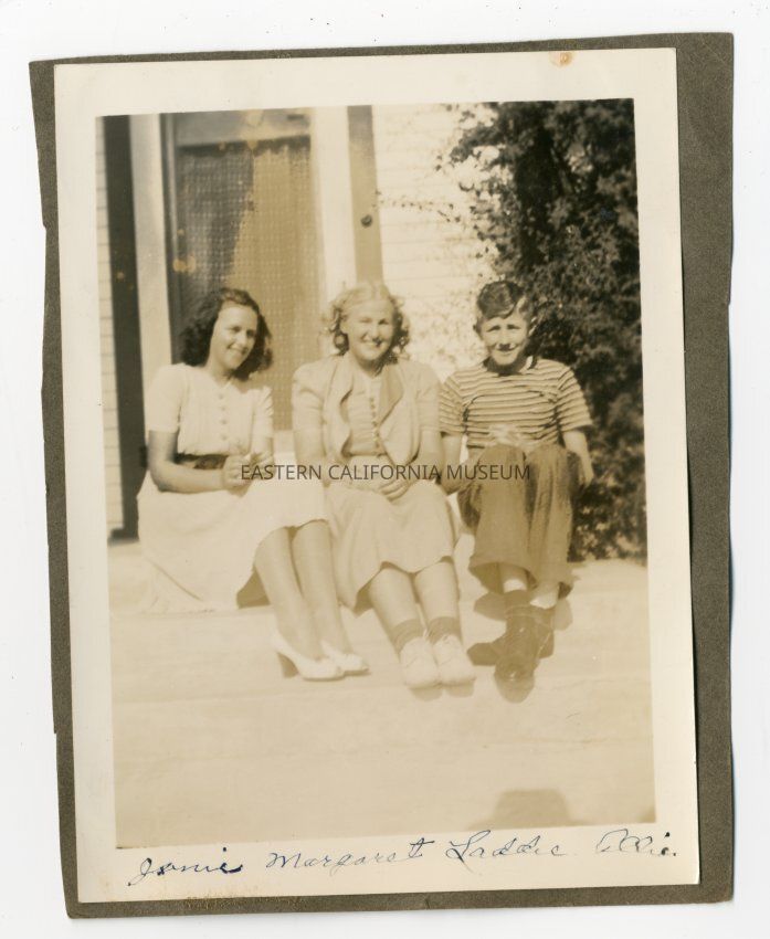 Three people sitting on stoop (Margaret in middle)
