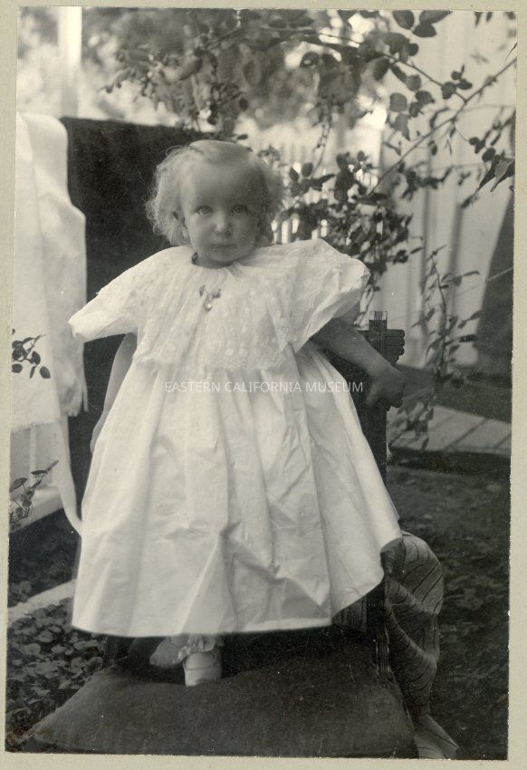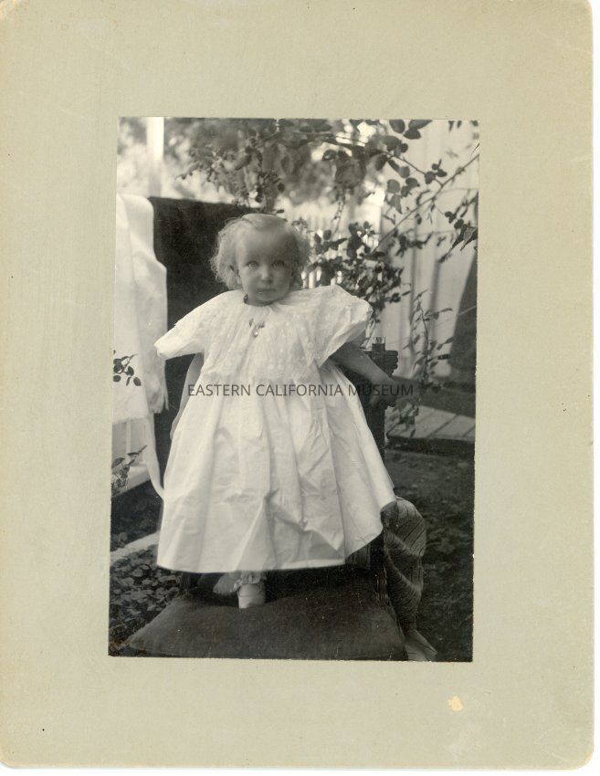 Mounted photo of a young child wearing a white dress standing on a chair outdoors. Writing in pencil on back: "Leroy Roeper, Independence."