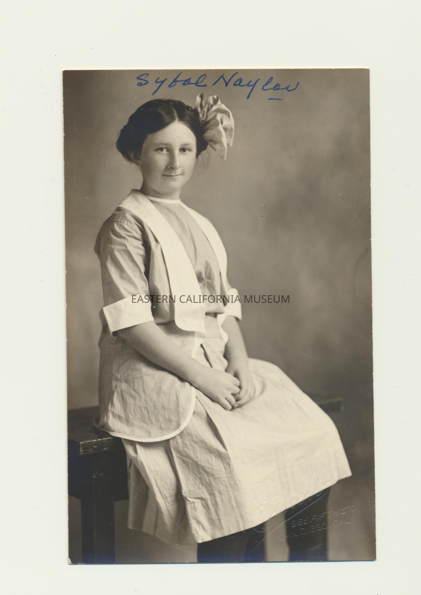 Studio portrait of Sybal Naylor (written above photo in blue ink) as a young girl with a large bow in her hair sitting on a bench. The photographer was Mitchell of San Diego, CA. Date of photo may be circa 1910 based on photographer's address.