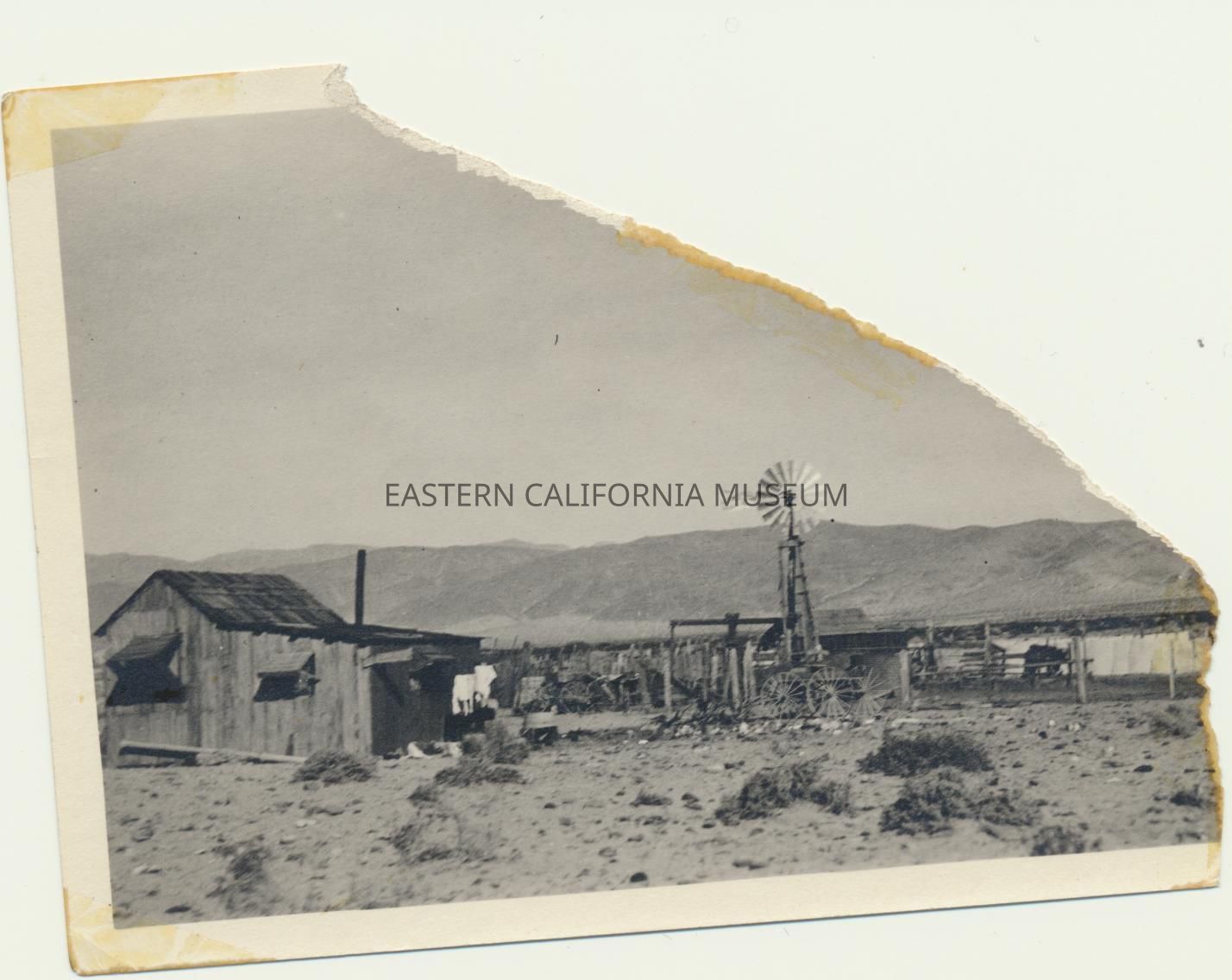 1995.12.34.25a-- Torn photo showing the camp from a distance, including windmill and building.