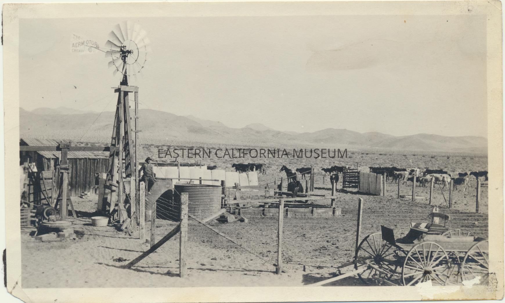 1995.12.34.25b--Closer photo of the windmill, water tank, corral, wagon, cattle, and a man sitting on top of a large barrel (more water storage?).