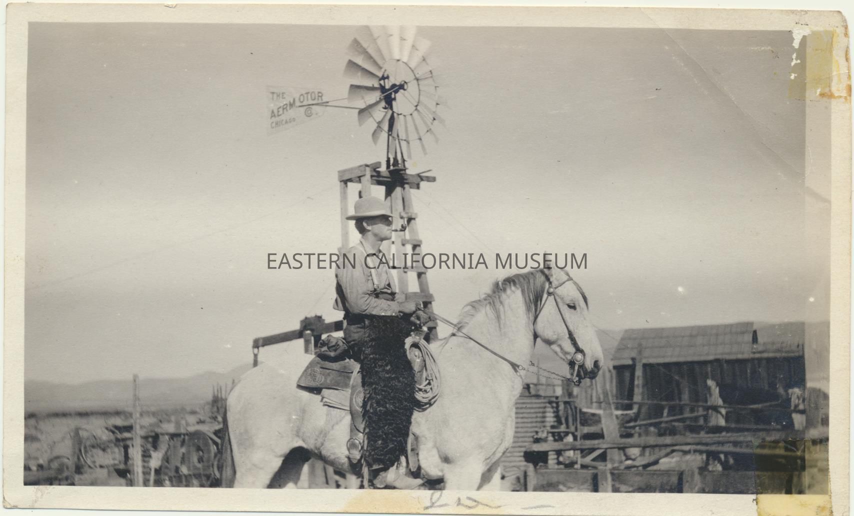 1995.12.34.25c--Cowboy on horseback wearing black wooly chaps (angora?). The windmill ("The Aermotor") and building are in the background. [Could this be Jimmy Callaway?]Photograph Details