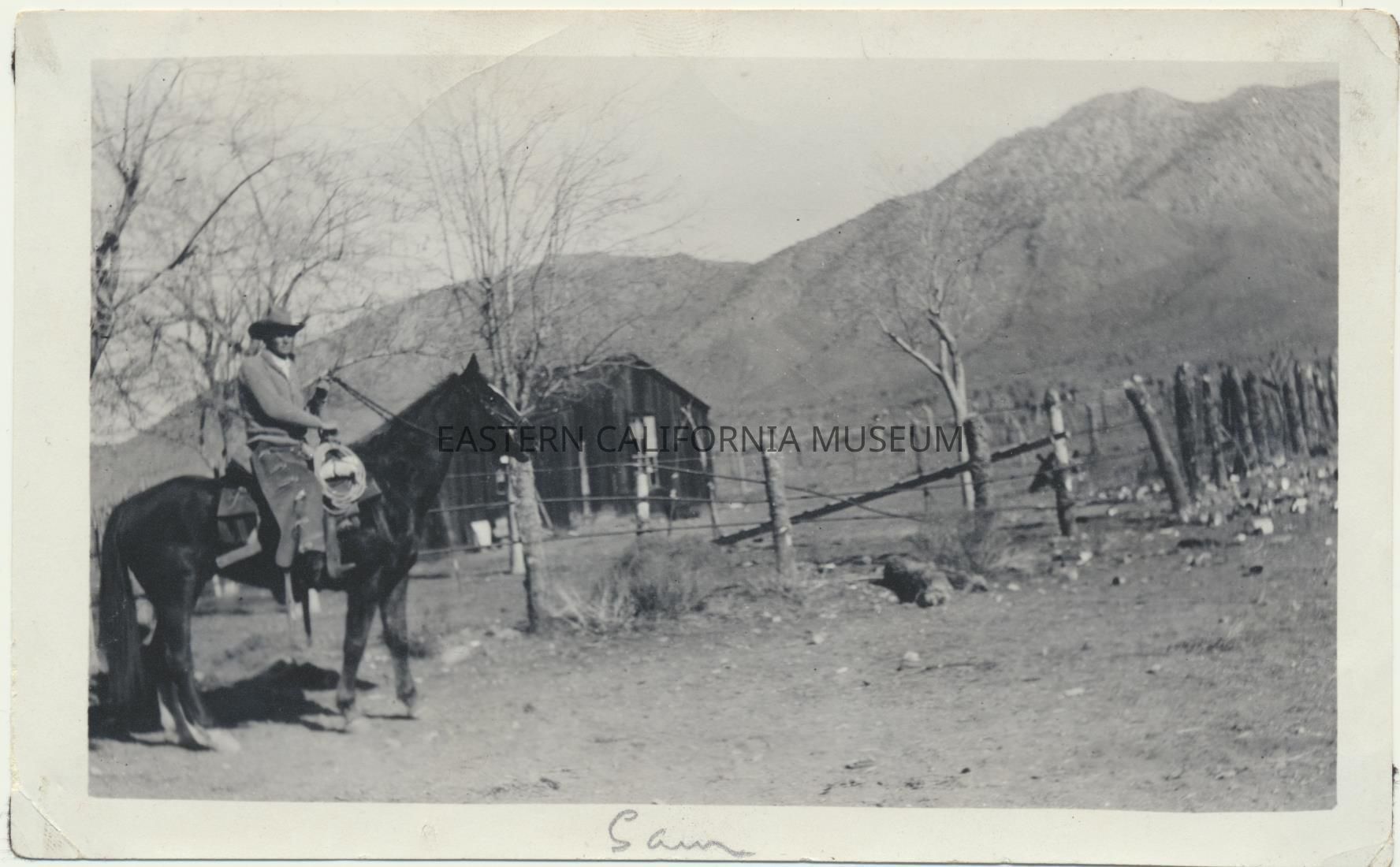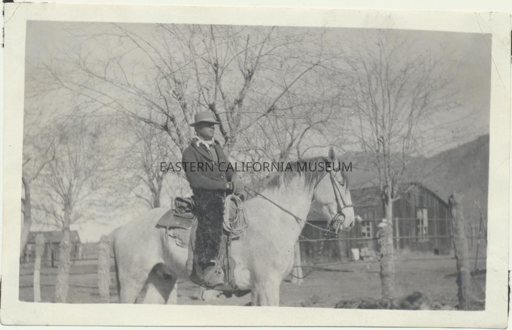 1995.12.34.26b--J. D. C. [Jimmy Callaway?] on a horse named Jim. He is wearing black wooly chaps (angora?).Photograph Details