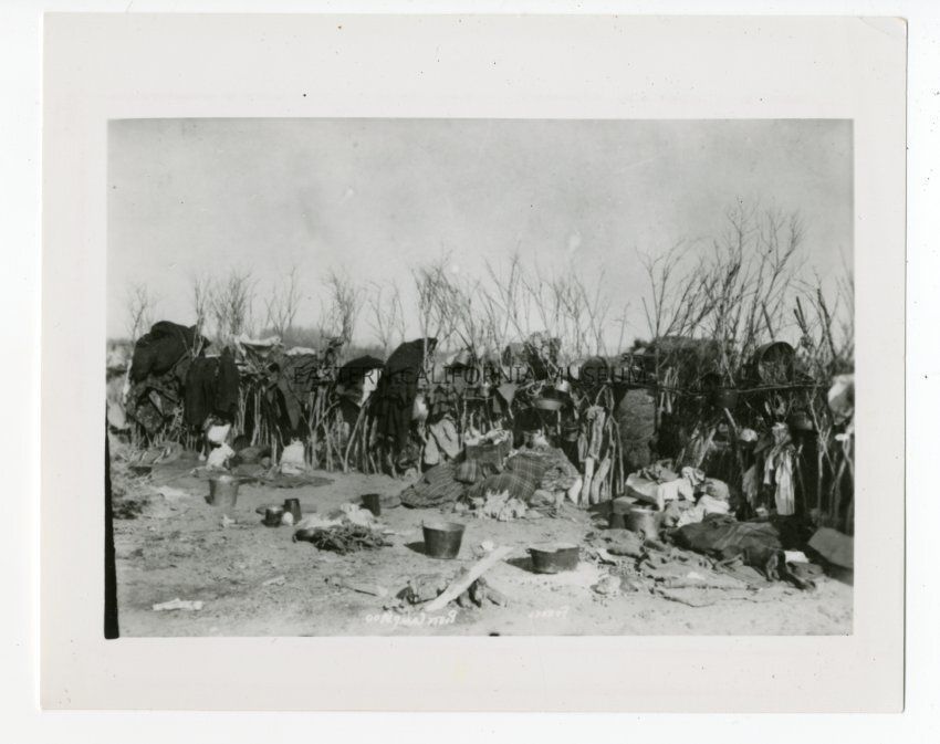 Photograph of clothing hung over a line (tree fence?), with cooking utensils on the ground in front. There appear to be children lying and kneeling on the ground. A. A. Forbes, Photographer.