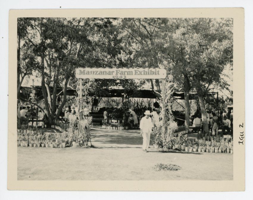 Black and white photo of the Manzanar Farm Exhibit sign at the Manzanar Fair in 1943. The tent covering the farm produce exhibit is visible in background.Photograph Details