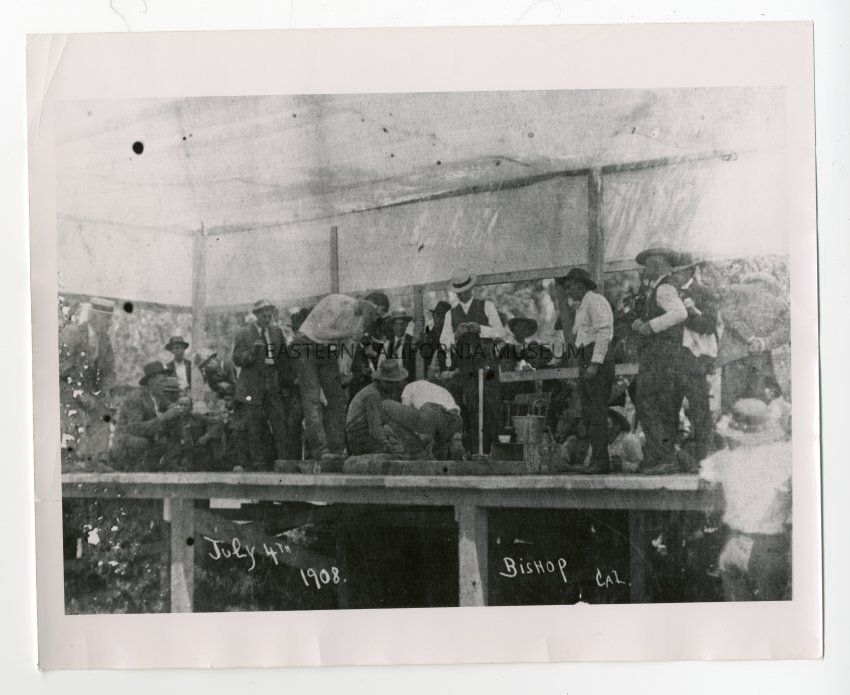 Print (not original) of Bishop on July 4, 1908. Group of men standing on a wooden stage. It looks like one many is holding a mallet and the other two men in the center may be assisting him. Rock spliting contest? Photo may be taken by A. A. Forbes. Some people identified are Jess Summers, Cashbaugh, and Len Liedy Bedy (sp?).