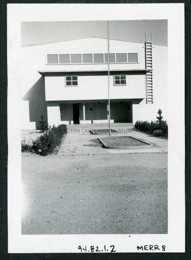 Photograph of the Manzanar Incarceration Camp auditorium after the camp is closed, the flagpole can been seen in front, with low shrubs to each side.