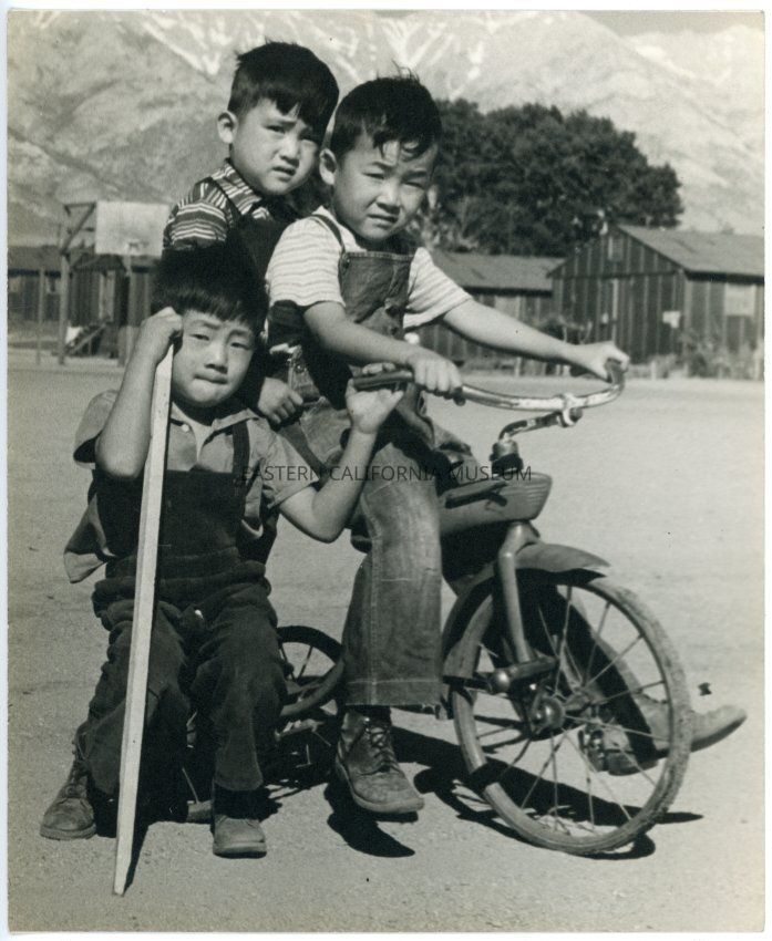 Photograph of three boys, two are on a tricycle, the other is holding a stick while sitting on the back wheel. Behind them is a basketball hoop and several barracks. The Sierra Nevada is in the background.Photograph Details