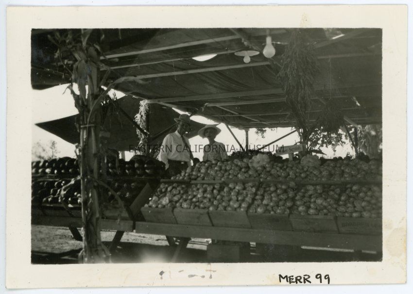 Photograph of farm produce at the Manzanar farm exhibit with two people standing in the background. The produce appears to be potatoes and eggplant with corn stalks used as decorations on the posts supporting the open air structure.