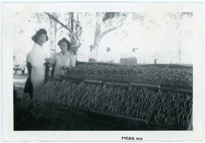 Photograph of vegetables at the Manzanar farm exhibit with two women in the background. The produce appears to be bean pods. Behind the stand several people can be seen, and the faint outline of the entrance sign.
