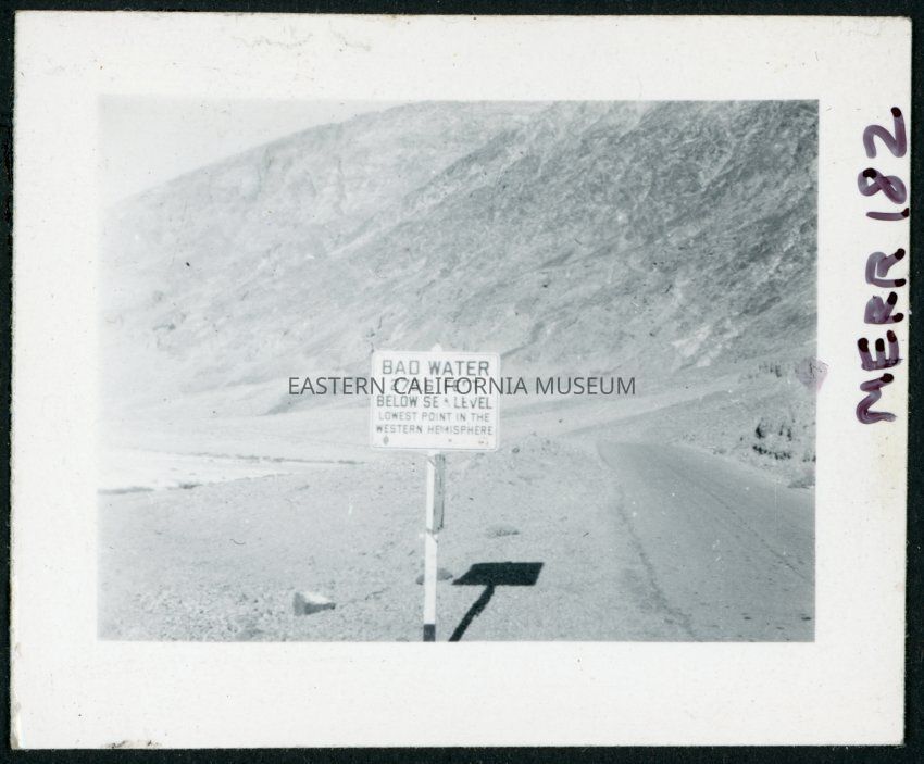Photograph of the sign at Bad Water in Death Valley National Park. "Bad Water; 279.6 feet below sea level; lowest point in the Western Hemisphere". The photograph is taken looking down the road that heads toward Furnace Creek.Collection