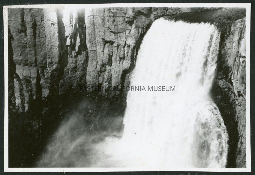 Photograph of the crest of Rainbow Falls near Mammoth Lakes, California. The rocks near the face of the falls are the only thing visible aside from the waterfall.Collection