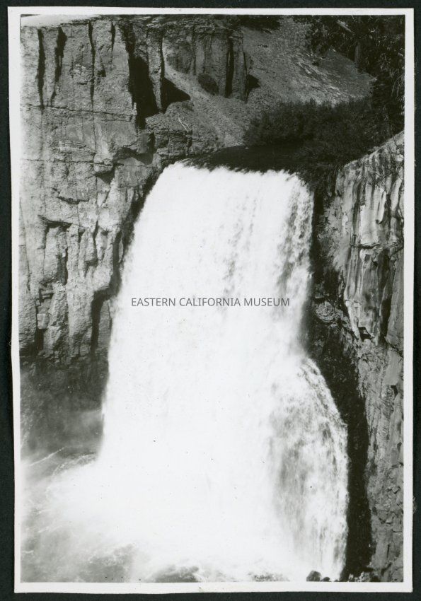 Photograph of the face of Rainbow Falls near Mammoth Lakes, California. The photograph includes the crest with the bushes lining the stream to the base and the cliffs on both sides of the falls.Collection