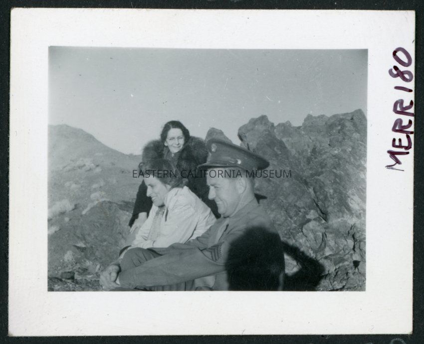 Photograph of L. Josephine Hawes, Theo Chamberlain and an army guard in Death Valley. The shadow of the photographer can be seen in the lower right corner.Collection
