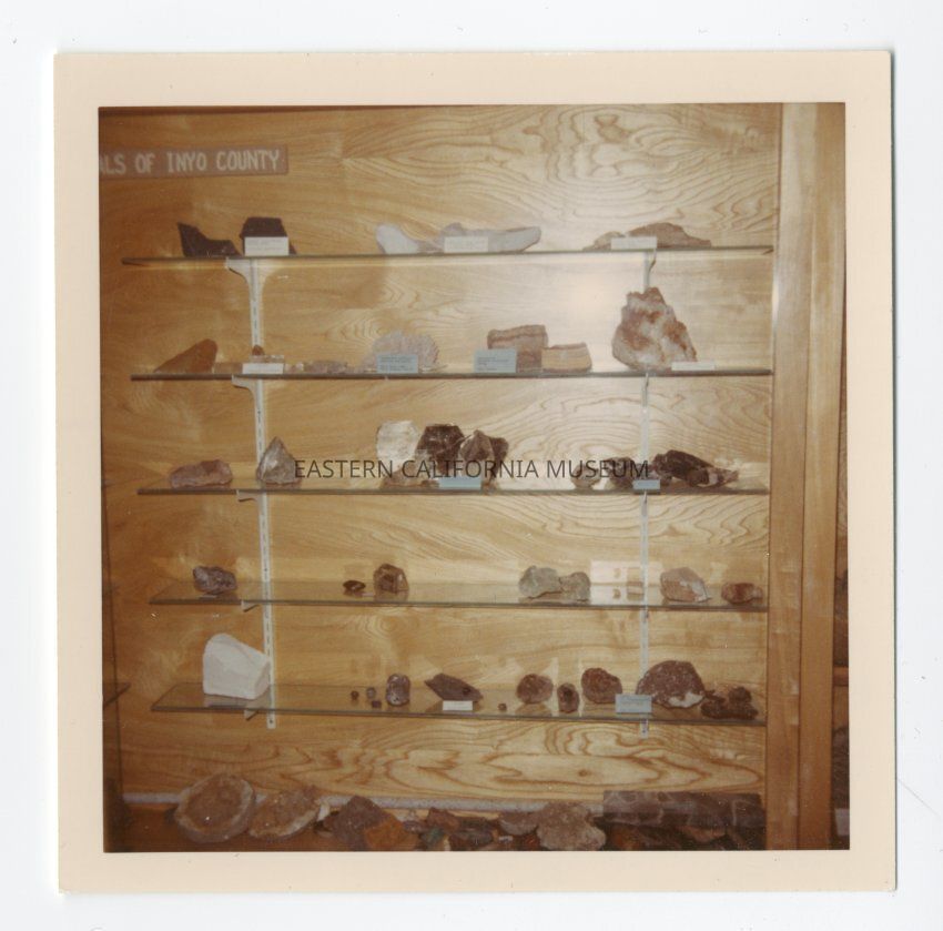 Small color photo of a display case of rocks and minerals inside the Eastern California Museum.