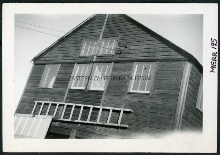 Photograph of a building with a ladder in front at Cow Creek Camp in Death Valley. Incarcees were transferred to the former Civilian Conservation Camp after the Manzanar Riot for their own protection.Collection