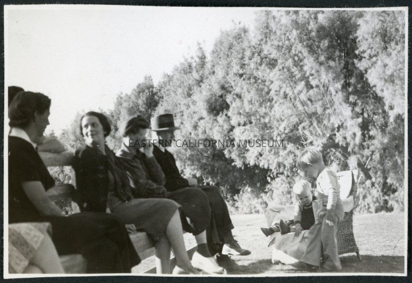 Photograph of five adults and two children in Death Valley National Park. The adults are sitting on a park bench and the two children are on a small wicker chair.Collection