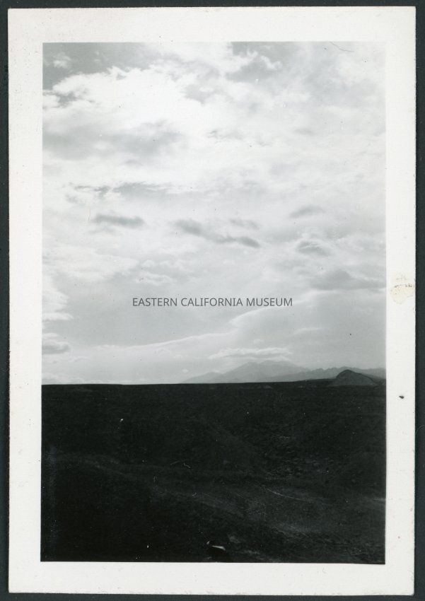 Photograph of an unknown location in Death Valley National Park. The foreground is very dark and a mountain range on the horizon and clouds filling the sky.Collection