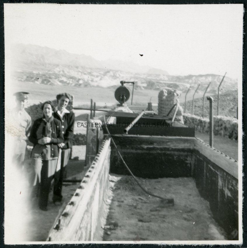 Photograph of L. Josephine Hawes, another woman, and an army guard standing next to Harmony Borax Works equipment in Death Valley National ParkCollection