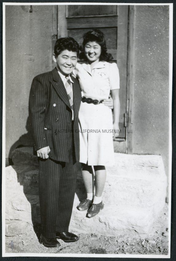 Photograph of a couple posing in front of a door at Cow Creek Camp in Death Valley National Park. Incarcees were transferred to the former Civilian Conservation Camp after the Manzanar Riot for their own protection.Collection